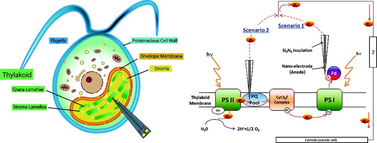 This research focuses on exploring the possibility of drawing electricity directly from biological cells. For this purpose we use the unicellular alga Chlamydomonas reinhardtii. In the organism, solar energy splits water into oxygen, protons and electrons driven by the excitation of the two photosystems of the photosynthetic electron transport system, located in the thylakoid membranes of chloroplasts. We employ nano-probe systems to locally capture the generated high energy electrons in order to harvest electrical energy.